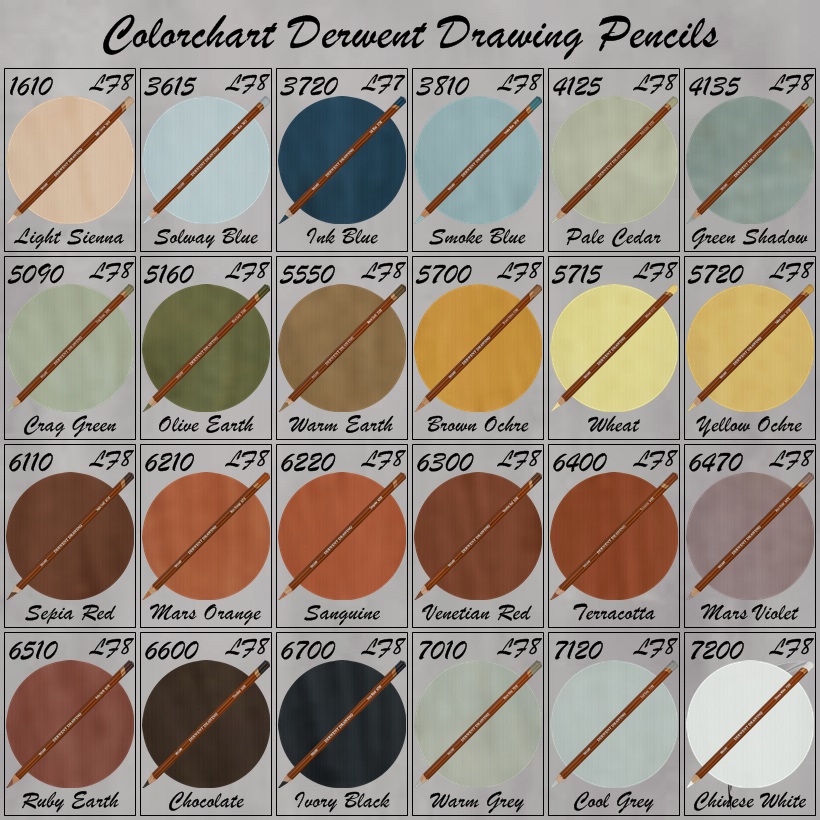 1610 Light Sienna , 3615 Solway Blue , 3720 Ink Blue , 3810 Smoke Blue , 4125 Pale Cedar , 4135 Green Shadow , 5090 Crag Green , 5160 Olive Earth , 5550 Warm Earth , 5700 Brown Ochre , 5715 Wheat , 5720 Yellow Ochre , 6110 Sepia Red , 6210 Mars Orange , 6220 Sanguine , 6300 Venetian Red , 6400 Terra Red , 6470 Mars Violet , 6510 Ruby Earth , 6600 Chocolate , 6700 Ivory Black , 7010 Warm Grey , 7120 Cool Grey , 7200 Chinese White
