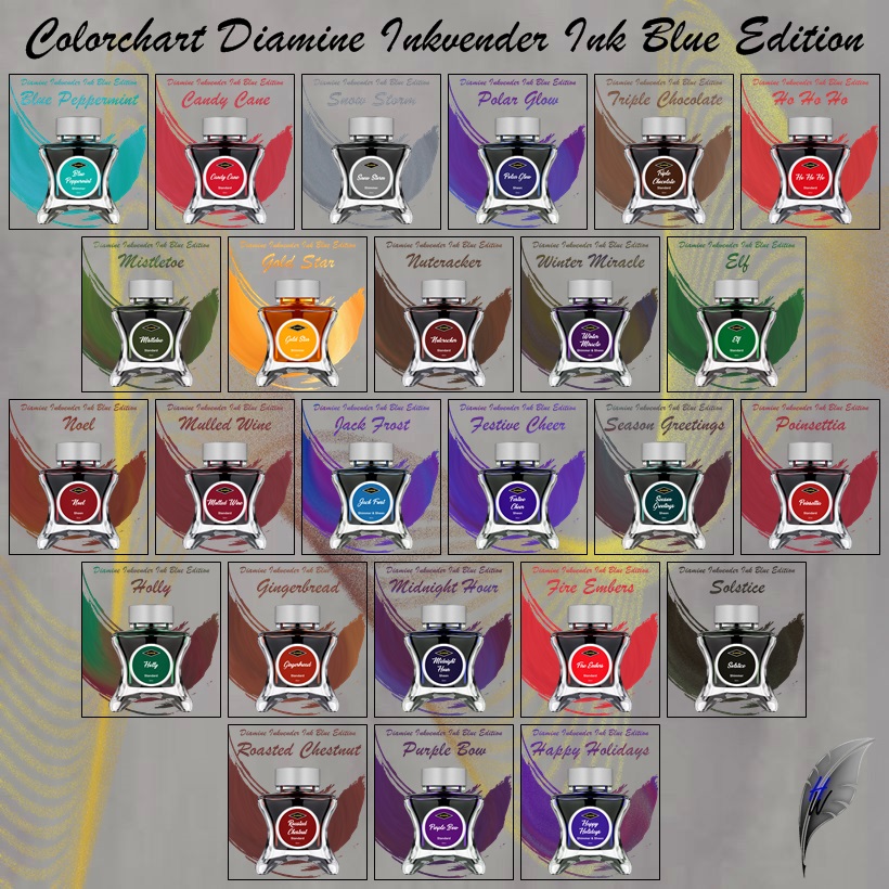 Blue Peppermint ( Sthimmer Ink ), Candy Cane ( Standard Ink ), Snow Storm ( Shimmer Ink ), Polar Glow ( Sheen Ink ), Triple Chocolate ( Standard Ink ), Ho Ho Ho ( Standard Ink ), Mistletoe ( Standard Ink ), Gold Star ( Shimmer Ink ), Nutcracker ( Standard Ink ), Winter Miracle ( Shimmer & Sheen Ink ), Elf ( Standard Ink ), Noel ( Sheen Ink ), Mulled Wine ( Standard Ink ), Jack Frost ( Shimmer & Sheen Ink ), Festive Cheer ( Sheen Ink ), Season Greetings ( Sheen Ink ), Poinsettia ( Standard Ink ), Holly ( Sheen Ink ), Gingerbread ( Standard Ink ), Midnight Hour ( Sheen Ink ), Fire Embers ( Standard Ink ), Solstice ( Shimmer Ink ), Roasted Chestnut ( Standard Ink ), Purple Bow ( Standard Ink ) und Happy Holidays ( Shimmer & Sheen Ink ).