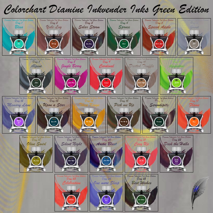 Die Diamine Inkvender Green Edition Inks – Tintenkollektion in 25 Sonderfarben aus dem Inkvent-Weihnachtskalender 2022.