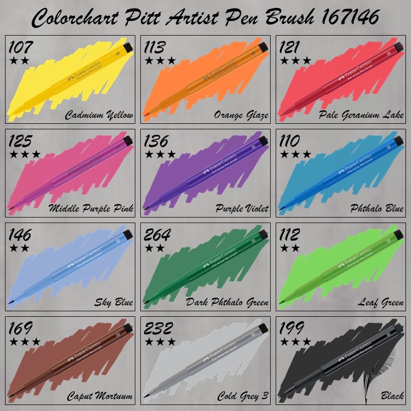 107 Cadmium Yellow , 113 Orange Glaze , 121 Pale Geranium Lake , 125 Middle Purple Pink , 136 Purple Violet , 110 Phthalo Blue , 146 Sky Blue , 264 Dark Phthalo Green , 112 Leaf Green , 169 Caput Mortuum , 232 Cold Grey 3, 199 BlackUnser gesamtes Sortiment der Pitt Artist Pens finden Sie hier.