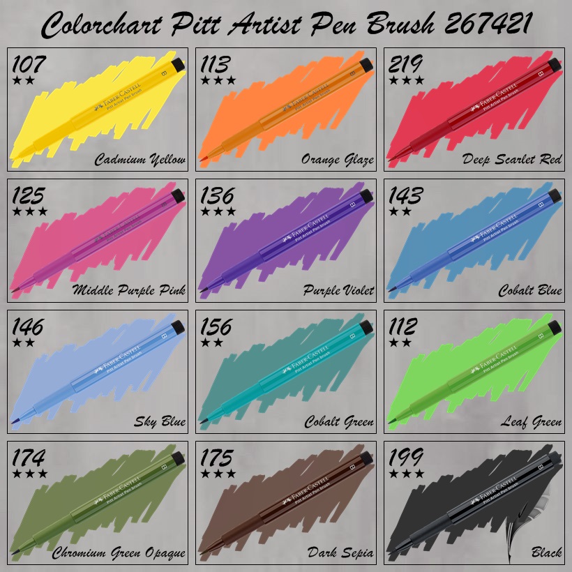 107 Cadmium Yellow , 113 Orange Glaze , 219 Deep Scarlet Red , 125 Middle Purple Pink , 136 Purple Violet , 143 Cobalt Blue , 146 Sky Blue , 156 Cobalt Green , 112 Leaf Green , 174 Chromium Green Opaque , 175 Dark Sepia , 199 Black