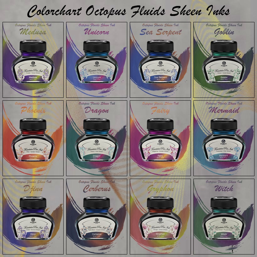 Die Octopus Sheen Füllhaltertinten – Schreibtinten mit Sheen-Effekt in 12 wunderschönen Farbkombinationen.