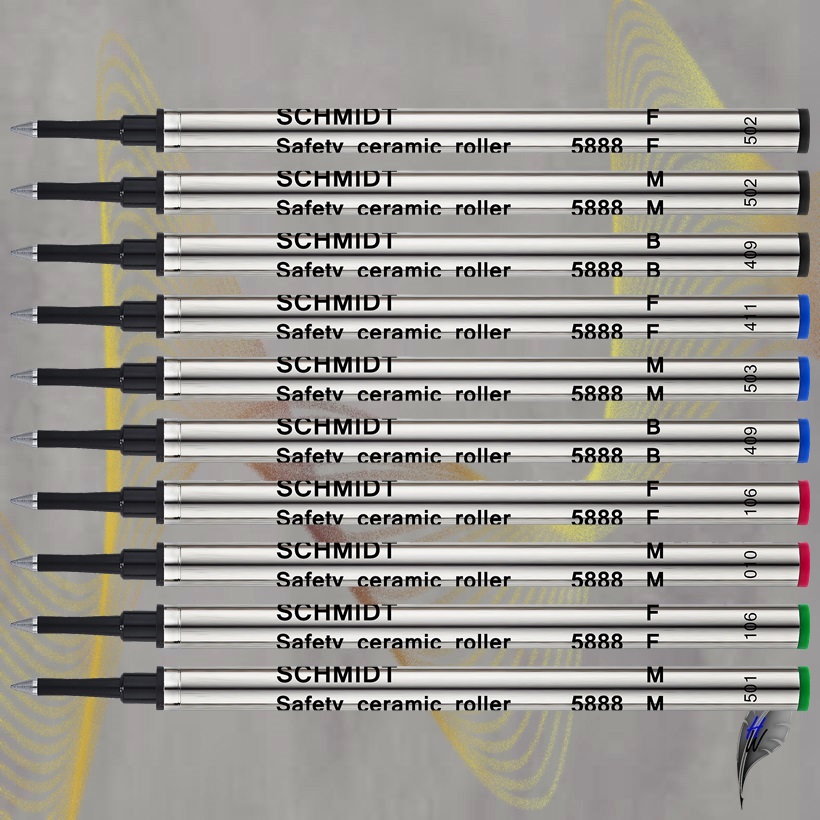 Die Schmidt Tintenrollerminen 5888 sind in den Farben Schwarz und Blau in den Strichbreiten F ( fein ) , M ( mittel ) und B ( breit ) , in Rot und Grün in den Strichbreiten F ( fein ) und M ( mittel ) lieferbar.