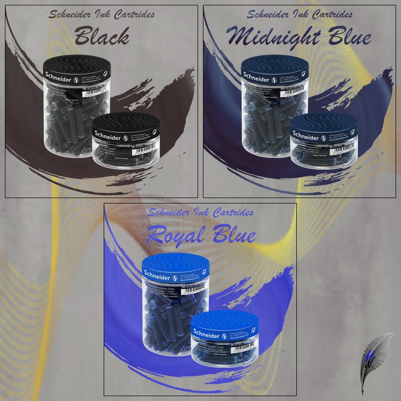 Die Schneider Tintenpatronen Standard sind in den Farben Schwarz, königsblau und mitternachtsblau erhältlich.