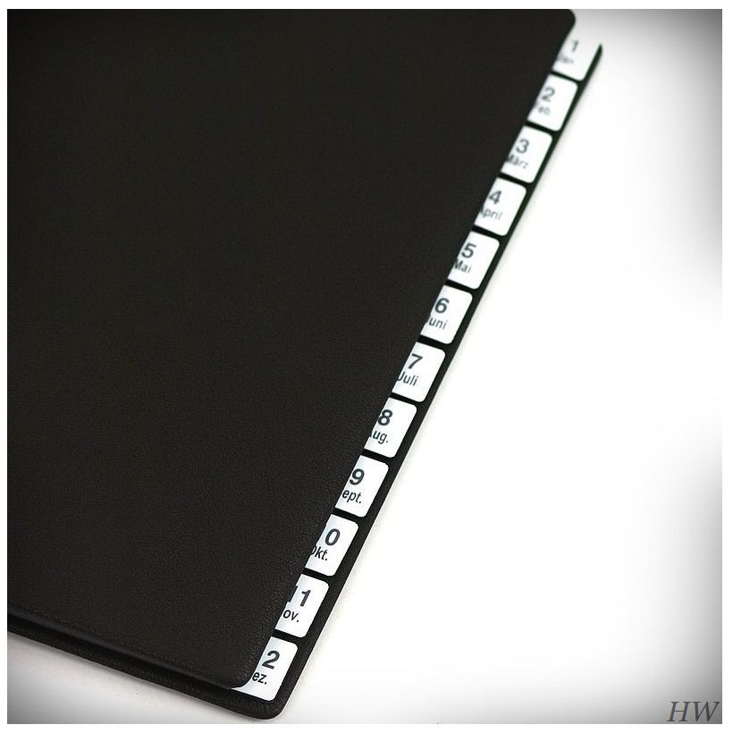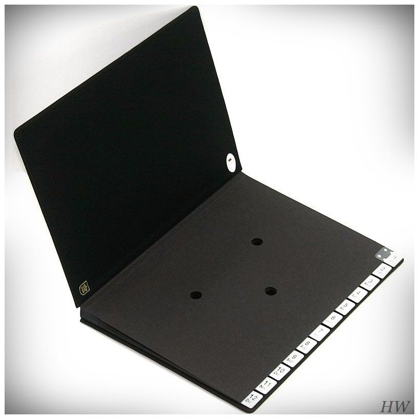 Die Register-Trennblätter sind aus schwarzen Kartonage mit Sichtlöchern hergestellt und ermöglichen die Aufnahme von Unterlagen bis DIN A4+ Fotmaten.