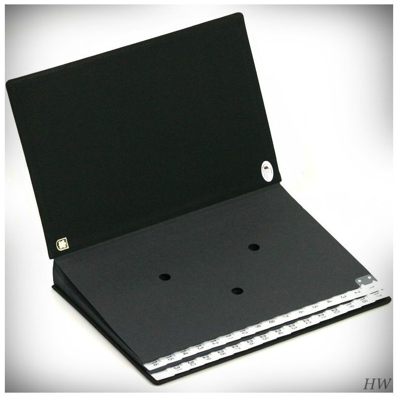 Die Register-Trennblätter sind aus schwarzen Kartonage mit Sichtlöchern hergestellt und ermöglichen die Aufnahme von Unterlagen bis DIN A4+ Fotmaten. Das leicht greifbare ergonomische Handregister aus weißen Kunststofftaben mit numerischer Unterteilung,erleichtern die Suche des gewünschten Dokumentes.