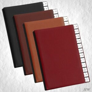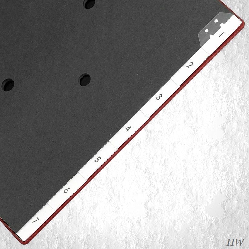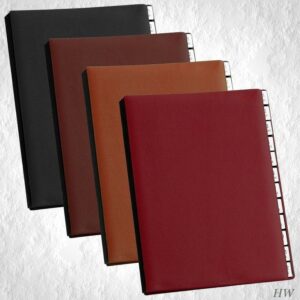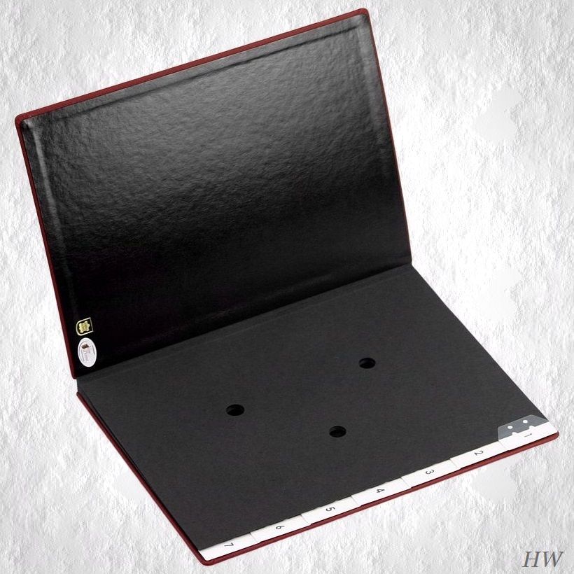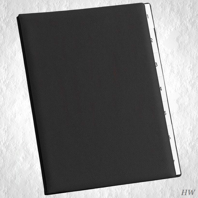 Der Pultordner hat einen dehnbaren und dadurch variablen Rücken. Die Register-Trennblätter sind aus schwarzen Kartonage mit Sichtlöchern hergestellt und ermöglichen die Aufnahme von Unterlagen bis DIN A4+ Fotmaten.