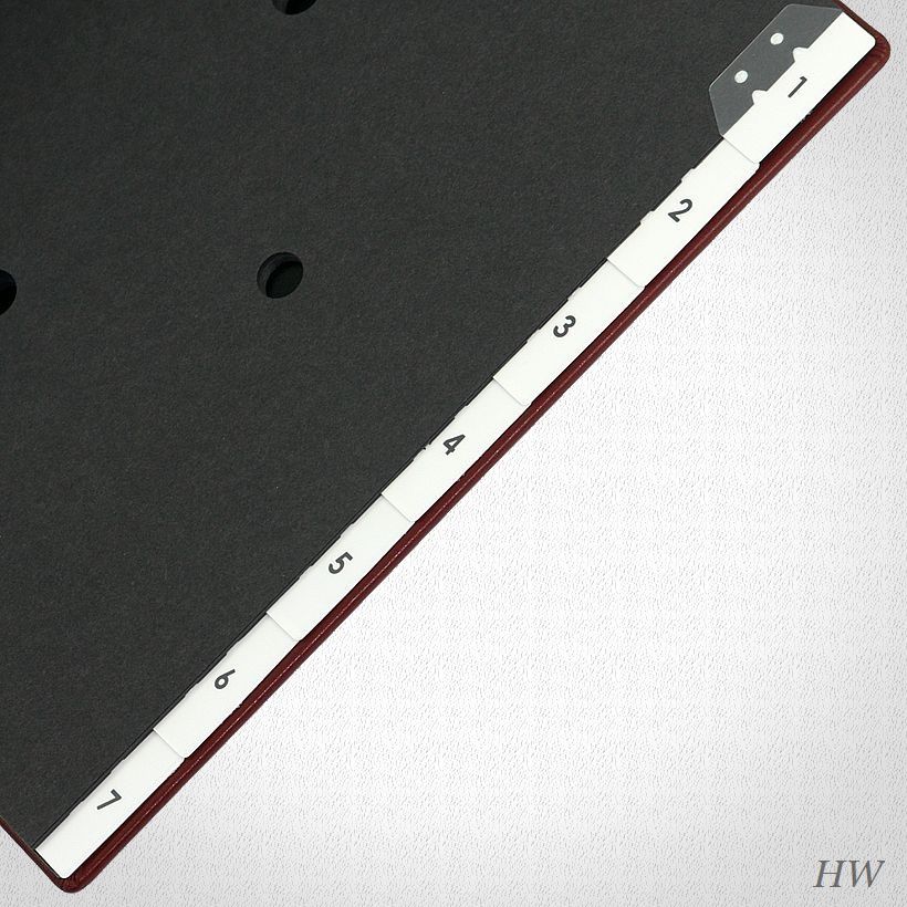 Die Register-Trennblätter sind aus schwarzen Kartonage mit Sichtlöchern hergestellt und ermöglichen die Aufnahme von Unterlagen bis DIN A4+ Fotmaten.