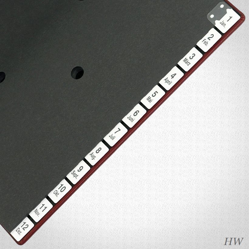 Das leicht greifbare ergonomische Handregister aus weißen Kunststofftaben mit numerischer Unterteilung von 1-12 ( Jan.-Dez. ),erleichtern die Suche des gewünschten Dokumentes.