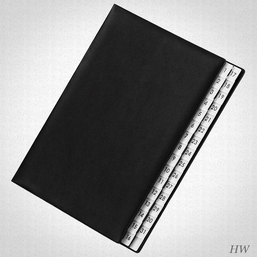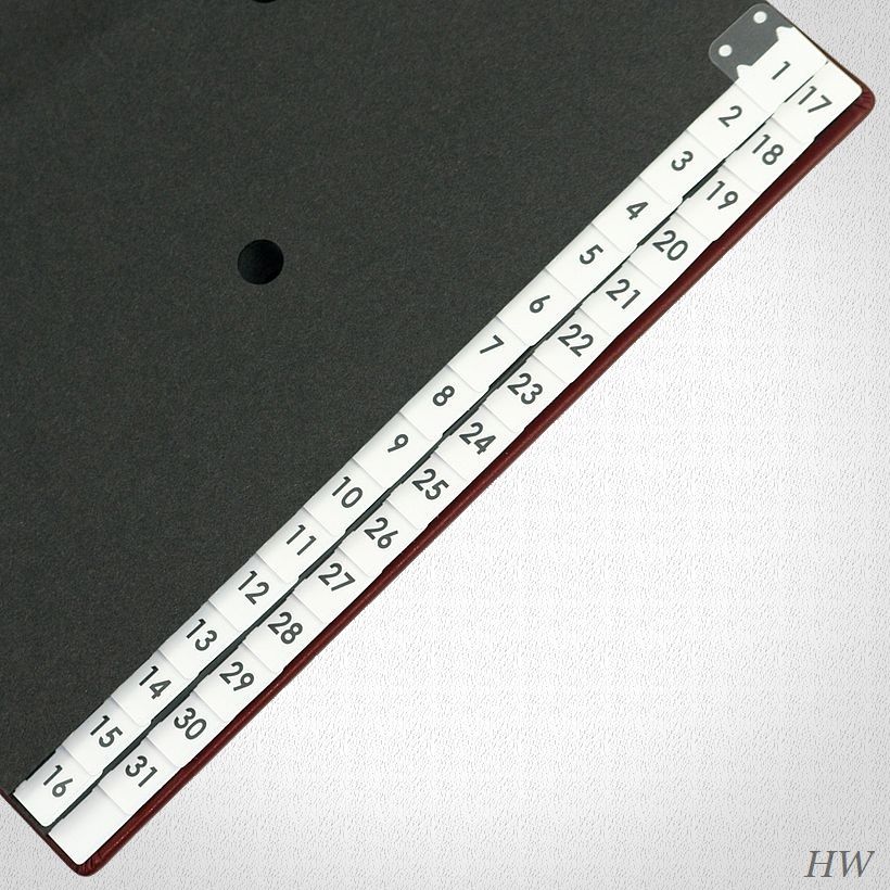 Das leicht greifbare ergonomische Handregister aus weißen Kunststofftaben mit numerischer Unterteilung von 1-31,erleichtern die Suche des gewünschten Dokumentes.