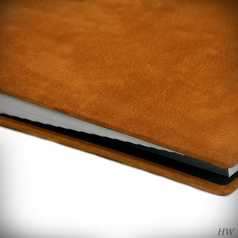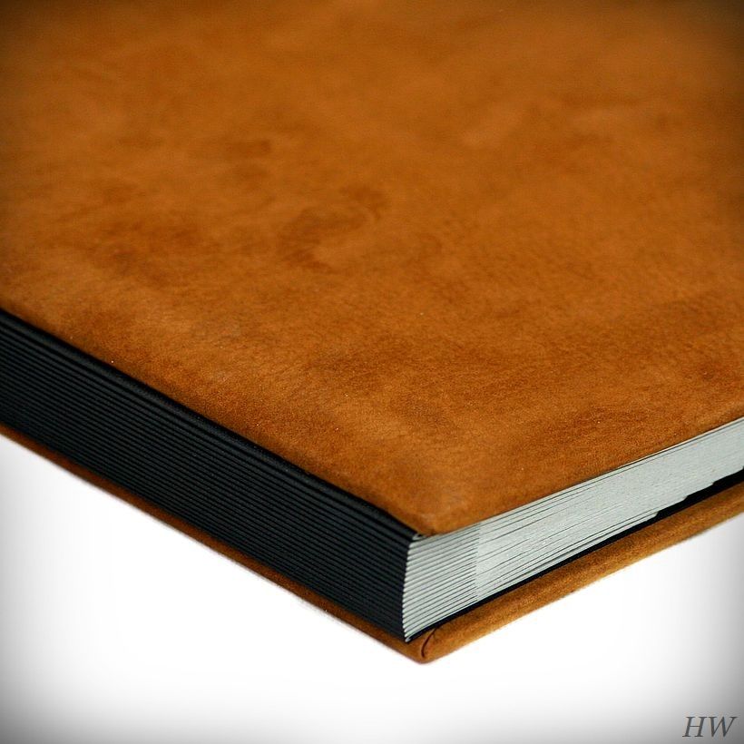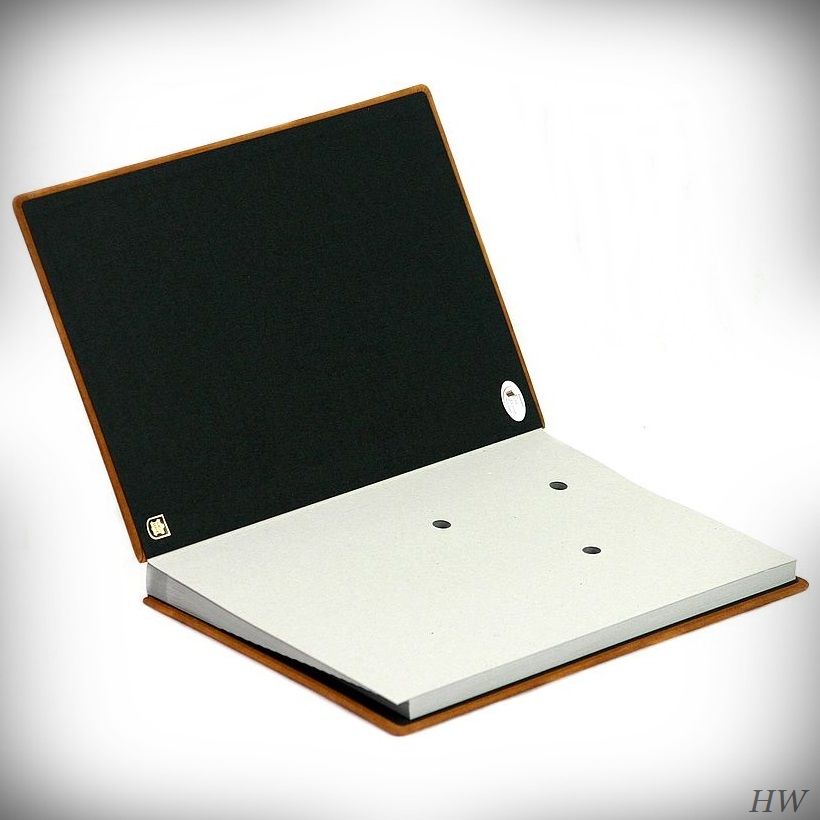 Vorder- und Rückendeckel sind innenseitig mit feinem,schwarzem Leinen kaschiert.