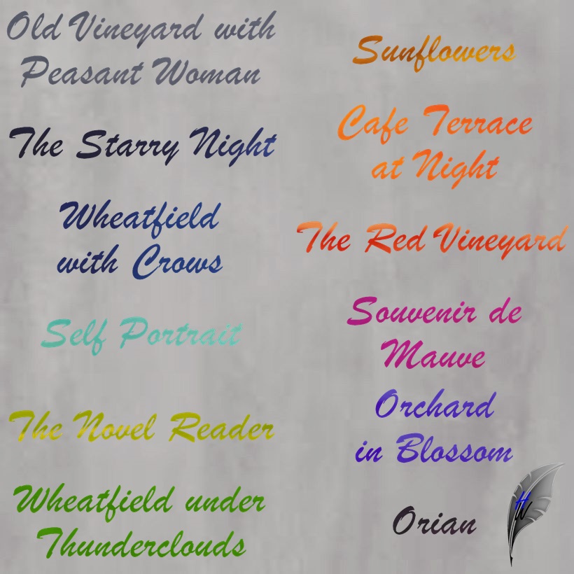 Old Vineyard with Peasant Woman, The Starry Night, Wheatfield with Crows, Self Portrait, The Novel Reader, Wheatfield under Thunderclouds, Sunflower, Cafe Terrace at Night, The Red Vineyard, Souvenir de Mauve, Orchard in Blossom und Orian.